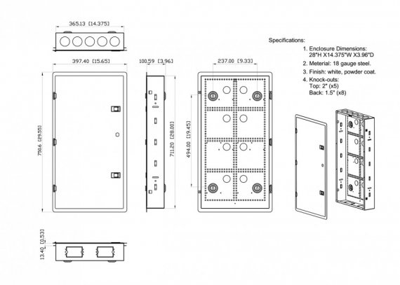 Hyperline 229982 Шкаф настенный с передними петлями, для скрытого монтажа, 28"(711.2) x 365.1 х 100.6 мм (ВхШхГ)