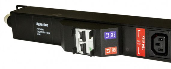 Hyperline SHE-36IEC-6BIEC-B-2.5PVB Блок розеток, вертикальный, 36 розеток IEC320 C13, 6 розеток IEC320 C19, автоматический выключатель, кабель питания 2.5м (3х4.0мм2) с вилкой IEC 60309 32A (2P+E), 250В, корпус алюминий, черный