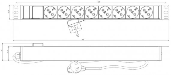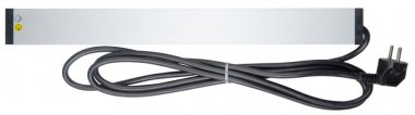 Hyperline SHZ19-8SH-S-2.5EU Блок розеток для 19" шкафов, горизонтальный, 8 розеток Schuko, выключатель с подсветкой, кабель питания 2.5м (3х1.5мм2) с вилкой Schuko 16A, 250В, 482.6x44.4x44.4мм (ШхГхВ), корпус алюминий
