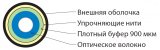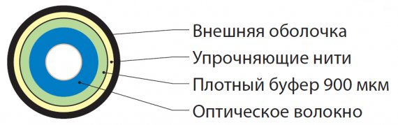 Кабель содержит 1 оптическое волокно в плотном буферном покрытии (tight buffer) 900 мкм. В кабеле используется либо типовое оптическое волокно (одномодовое или многомодовое), либо одномодовое волокно SMF-28® Ultra (G652.D) с минимальными потерями на изгибах малого радиуса. Конструкция усилена упрочняющими арамидными нитями. Внешняя оболочка из полимерной композиции, не распространяющей горение, не выделяющей корозионно-активных газообразных продуктов при горении и тлении и с низкой токсичностью продуктов горения (исполнение нг(А)-HFLTx).