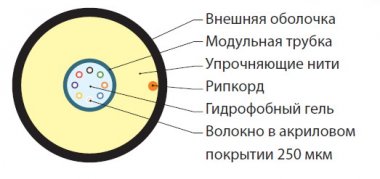 Кабель со свободной укладкой волокон в центральном гелезаполненном модуле (single loose tube). Содержит 4–24 оптических волокна в первичном защитном покрытии 250 мкм. Волокна свободно уложены в модуле (трубке), заполненном гидрофобным тиксотропным гелем. Конструкция усилена упрочняющими стекловолоконными нитями и защищена внешней оболочкой из полиэтилена. Для удобства разделки кабеля под внешней оболочкой предусмотрен рипкорд. Внешняя оболочка соответствует требованиям для прокладки в стояках, устойчива к воздействию УФ, выполнена из малодымного безгалогенного компаунда, не распространяющего горение (LSZH).