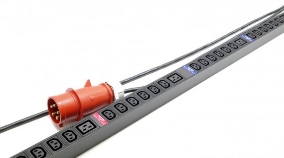 Hyperline SHE-36IEC-6BIEC-3x32-3PVR Блок розеток, вертикальный, 36 розеток IEC320 C13, 6 розеток IEC320 C19, кабель питания 3м (5х4.0мм2) с вилкой IEC 60309 32А (3P+N+E), 380В, корпус алюминий, черный