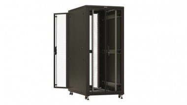 Hyperline TTBR-3288-DD-RAL9004 Шкаф напольный 19-дюймовый, 32U, 1610x800х800 мм (ВхШхГ), передняя и задняя распашные перфорированные двери (75%), ручка с замком, 2 вертикальных кабельных организатора, цвет черный (RAL 9004) (разобранный)