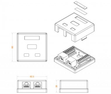 Hyperline SB1-2-8P8C-C5e-WH Розетка компьютерная RJ-45(8P8C), категория 5e, двойная, внешняя, Dual IDC