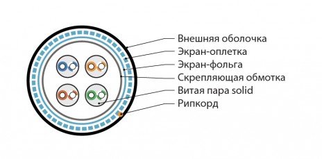 Hyperline SFUTP4-C5E-S24-OUT-PE-BK-500 (500 м) Кабель витая пара, экранированная (SF/UTP4), категория 5E, 4 пары (24AWG), одножильный (solid), общий экран - фольга и оплетка, PE, - 40°C - + 70°C, черный