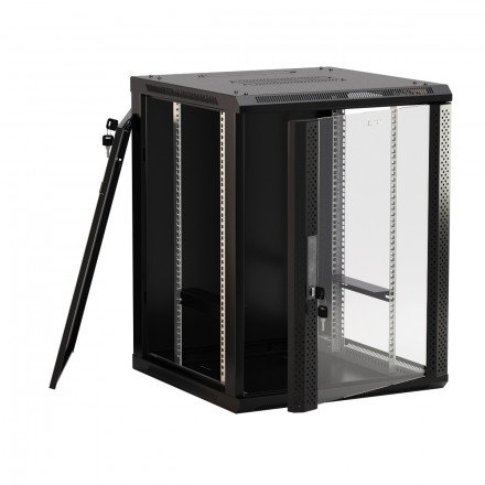Hyperline TWB-FC-2766-GP-RAL9004 Шкаф настенный 19-дюймовый (19"), 27U, 1316x600х600мм, стеклянная дверь с перфорацией по бокам, ручка с замком, с возможностью установки на ножки (в комплекте), цвет черный (RAL 9004) (разобранный)